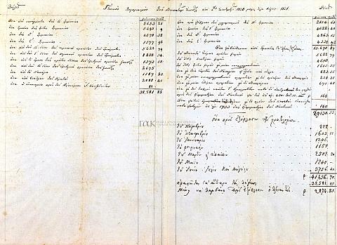 Αντίγραφο Γενικού λογαριασμού (ισολογισμού) του Διοικητηρίου Σκοπέλου για το διάστημα από πρώτη Σεπτεμβρίου 1830 μέχρι το τέλος Αυγούστου 1831. Στο έγγραφο φαίνεται το ποσόν που οφείλει η Διοίκηση στον πρώην Διοικητή Σκοπέλου Κ. Μ. Μηλαϊτη. (βλ. επίσης εγγρ. 15-16/Υποφακ.1).