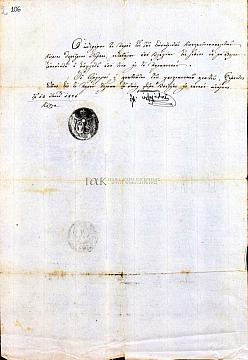 Διαβατήριο του Δημητρίου Νέγρη. Yπογράφεται από τον Αλέξανδρο Υψηλάντη και φέρει σφραγίδα [με οικόσημο;]