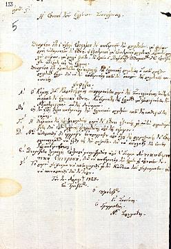 Ψήφισμα (αριθμ. 5) της Εθνοσυνέλευσης της Τροιζήνας, με το οποίο ο Ι. Καποδίστριας αναγορεύεται Κυβερνήτης της Ελλάδας για επτά χρόνια. Συγχρόνως ψηφίζεται και ο διορισμός τριμελούς επιτροπής ονομαζομένης Αντικυβερνητική Επιτροπή με καθήκον την αναπλήρωση του Κυβερνήτη σε περίπτωση απουσίας του. Υπογράφεται από τον Πρόεδρο Γ. Σισίνη και τον Γραμματέα Ν. Σπηλιάδη. Αντίγραφο. Τροιζήνα 02.04.1827