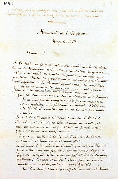 Προκήρυξη (manifeste) του Αυτοκράτορα Ναπολέοντα Γ΄ προς τους Γάλλους, με την οποία κηρύσσει τον πόλεμο εναντίον της Αυστρίας ύστερα από την αυστριακή επίθεση εναντίον της Σαρδηνίας (βλ. εγγρ. 163).