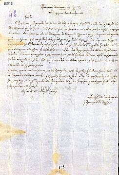 Σχέδιο εγκυκλίου (αριθμ. 103) του Μινιστερίου των Εσωτερικών προς ένα έκαστο των πληρεξουσίων του Αιγαίου (όνομα πληρεξουσίου και νήσου ασυμπλήρωτο) σχετικά με τη συνεισφορά κάθε νησιού (μέχρι να συμπληρωθεί το ποσό των 287.000 γροσίων για να εξασφαλισθεί ο έκπλους του ελληνικού στόλου καθ’ όσον ο τουρκικός στόλος έχει ήδη συγκεντρωθεί στα Δαρδανέλια).