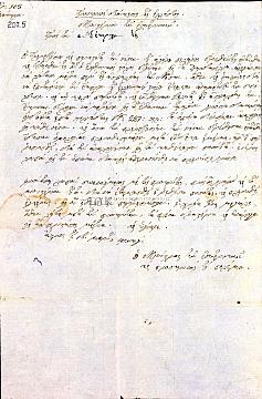 Σχέδιο εγκυκλίου (αριθμ. 103) του Μινιστερίου των Εσωτερικών προς ένα έκαστο των πληρεξουσίων του Αιγαίου (όνομα πληρεξουσίου και νήσου ασυμπλήρωτο) σχετικά με τη συνεισφορά κάθε νησιού (μέχρι να συμπληρωθεί το ποσό των 287.000 γροσίων για να εξασφαλισθεί ο έκπλους του ελληνικού στόλου καθ’ όσον ο τουρκικός στόλος έχει ήδη συγκεντρωθεί στα Δαρδανέλια).