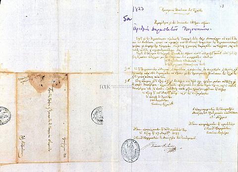 - Εγκύκλιος (αριθμ. 130) του Μινιστερίου των Εσωτερικών προς τους Εφόρους και Προκρίτους της Επαρχίας Κορίνθου σχετική με την ταχεία εκλογή και αποστολή των αντιπροσώπων τους στη Συνέλευση. Υπογράφεται από τον Μινίστρο των Εσωτερικών και Προσωρινό του Πολέμου Ι. Κωλέττη και το Γεν. Γραμματέα Ιωάννη Θεοτόκη.