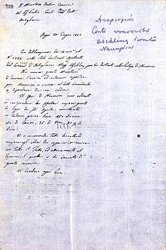 Σχέδιο επιστολής του Μινίστρου του Πολέμου προς τον Pietro Conti, Tenente dell’ Artiglieria, με την οποία του γνωστοποιεί την απόφαση διορισμού του (αιθμ. 1768/ 18.06.1822) στη θέση του Ajutante del Comandante d’ Artiglieria Mag.r Aschling, διοικητή του Ναυαρίνου, τον ενημερώνει για την αναχώρησή του καθώς και τα τρόφιμα που δικαιούται ημερησίως και του συστήνει τέλος να επιδείξει ζήλο και υπακοή. Άργος, 20.06.1822