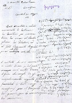 Σχέδιο επιστολής-διαβιβαστικού του Μινίστρου του Πολέμου (Ministro della Guerra) προς τον Commissario (θέση του ονόματος κενή), με την οποία τον ενημερώνει σχετικά με το διορισμό προσώπων επιφορτισμένων με την αγορά των τροφίμων για τους Φιλέλληνες, του διαβιβάζει αντίγραφο σχετικού συμφωνητικού και υποδεικνύει να τους παρέχονται ανα δεκαήμερο τα αναγκαία χρήματα για τις αγορές καθώς και τα μεταφορικά. Κόρινθος, 21.05.182[2]