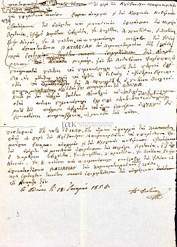 Σχέδιο πιστοποιητικού που συντάσσει και υπογράφει ο Ι. Θεοτόκης, με το οποίο πιστοποιείται ότι κατά το έτος 1825 (που κατείχε το αξίωμα του Υπουργού της Δικαιοσύνης) οι Μαυροκορδάτος και Τρικούπης ζήτησαν την προστασία της Αγγλίας, ενώ οι Δ. Υψηλάντης, Ι. Κωλέττης, Δ. Χριστίδης, Ι. Θεοτόκης, Γ. Αινειάν, Ι. Κ. Σούτσος και Π. Σοφιανόπουλος επιθυμούσαν να καταστήσουν τη δημοκρατούμενη τότε Ελλάδα Βασίλειον.Aθήνα, 18.01.1853