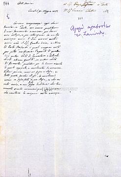 Σχέδιο επιστολής του Μινίστρου του Πολέμου Ι. Κωλέτττη προς τον Giorgio Tartari στη Ζάκυνθο, με την οποία τον ενημερώνει για την επικείμενη άφιξη στο νησί του των Lambro Veico και Nicolo Costa Bussachi με σκοπό την αγορά σιτηρών και ζητάει τη συνδρομή του για τη διευκόλυνση αυτού του εφοδιασμού. Κόρινθος, 01.05.1822