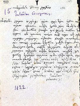 Επιστολή του Ιωάννη Χ. προς τον παπά Λευθέρι στα Μέγαρα, με την οποία ζητεί επειγόντως στρατιωτικές ενισχύσεις, επειδή έχει καταφθάσει το τούρκικο ασκέρι .