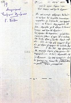 Διαβιβαστικό επιστολής [του Μινίστρου των Εσωτερικών;] προς τον Γεώργιο Λέλη, με την οποία του ανακοινώνεται ο διορισμός του στο αξίωμα του Γενικού Επάρχου καθ’ όλον τον Όλυμπον.