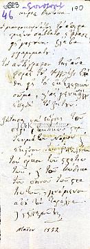 Σημείωμα προς τον Ι. Θεοτόκη, με το οποίο, αφ’ ενός του γνωστοποιείται η άφιξη του Μαυροκορδάτου στη Γαστούνη, και αφ’ ετέρου του ζητείται νέο αντίγραφο αναφοράς Άγγλου (στρατιώτη), ο νόμος περί των τακτικών στρατευμάτων, ο όρκος των φιλελλήνων καθώς και ο κώδικας ποινών των στρατιωτών.
