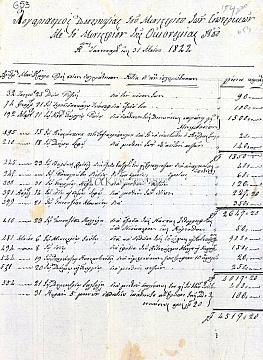 Έγγραφο ριγωμένο που φέρει τις εξής στήλες: αριθμός, μην, ημέρα, προς ποίον επληρώθησαν, αιτία δι’ ην επληρώθησαν, γρόσια, παράδες. Για το διάστημα 01.01 - 31.05.1822