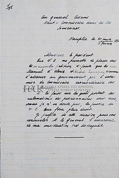 Απαντητική επιστολή σε αίτηση του Κυβερνήτη να δοθεί άδεια στον διοικητή του Κάλαμου να διανείμει στους εκεί πρόσφυγες της ηπειρωτικής Ελλάδας οικονομική βοήθεια εκ μέρους του Κυβερνήτη. Τον διαβεβαιώνει ότι η διοίκηση κάνει όλα όσα είναι αναγκαία για την περίθαλψή τους (4).
