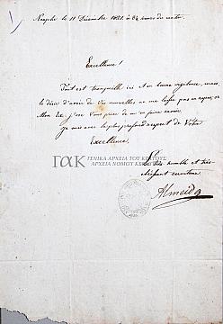 1) Επιστολή Αλμέϊδα από Ναύπλιο προς Αυγ. Καποδίστρια στο Άργος 11/12/1831. Ενημερώνει ότι όλα είναι ήσυχα και εν τάξει.