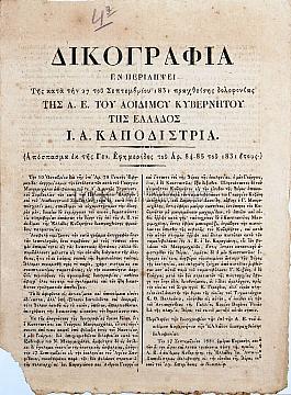 Λέξεις-κλειδιά: Καποδίστριας Αυγουστίνος, Καποδίστριας Ιωάννης, Καραγιάννης Παναγιώτης, Καποδίστριας-δολοφονία, δικογραφία, Γενική Εφημερίς της Ελλάδος, Ναύπλιο