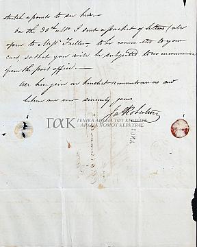 Εντόπισε στην Πύλο επιστολή με παραλήπτη τον Γ. Φίνλεϋ και γνωρίζοντας τις πολιτικές του αντιλήψεις, το άνοιξε, το διάβασε και το στέλνει στον Αυγουστίνο, προτείνοντας να μην δοθεί καν στον παραλήπτη. Επισυνάπτει την επιστολή. Αναφορά στην αντιπολίτευση της επαρχίας και τις ενέργειές της, μνεία στον Β. Χρηστακόπουλο (1, 1α).