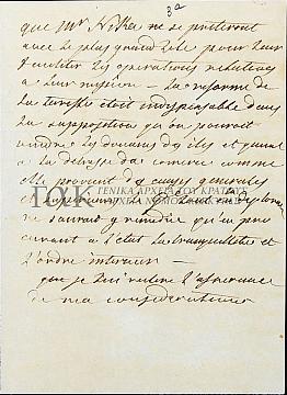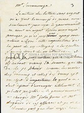 Περιγράφει τις ενέργειες και τις προσπάθειες που κάνει αυτός και ο κος Νίκας προκειμένου να πείσει τους συμπολίτες τους να μένουν ήσυχοι και πιστοί στην Κυβέρνηση, σημειώνει ότι η κατάσταση του εμπορίου επιδεινώνεται και παραθέτει τους λόγους γι' αυτό (κυκλοφορία χαρτονομισμάτων, τελωνειακές ρυθμίσεις κ.λπ.). Κλείνει με μερικές προτάσεις για την βελτίωση της οικονομικής κατάστασης (3).