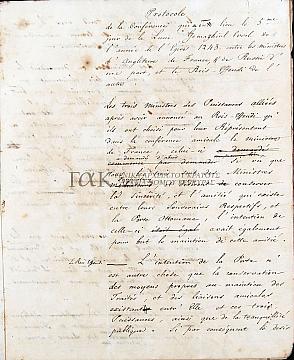 Περιέχει σχέδιο Πρωτοκόλλου συνδιάσκεψης των τριών Πρεσβευτών (Αγγλίας, Γαλλίας, Ρωσίας) με τον Ρεΐς Εφέντη, σσ. 37. Αναφέρεται η 5η Ιουνίου του 1243 (έτος Εγίρας) [1].