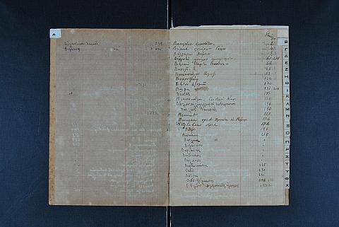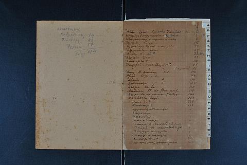 Χαρτόδετο αλφαβητικό Ευρετήριο που περιλαμβάνει ονόματα με τα οποία αλληλογραφεί ο Ι. Καποδίστριας. Δίπλα σε κάθε όνομα σημειώνεται παραπομπή για τον αντίστοιχο Φάκελο. Υπάρχουν διαφορετικοί γραφικοί χρακτήρες, μεταγενέστερες προσθήκες.