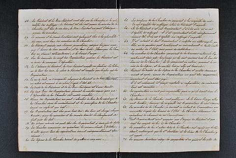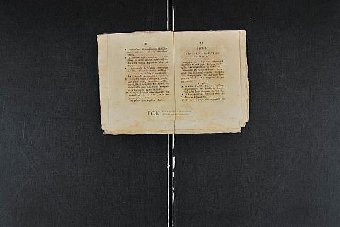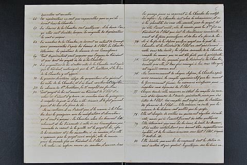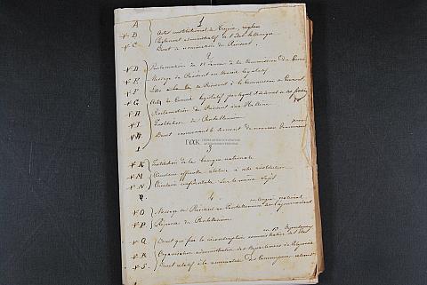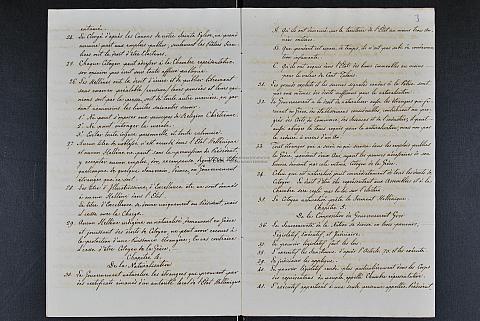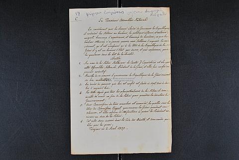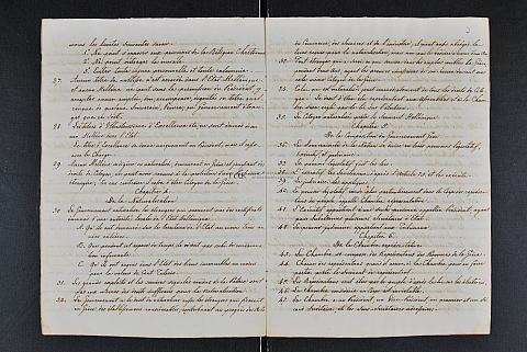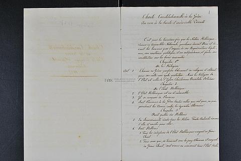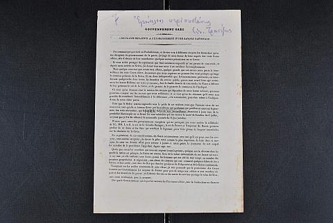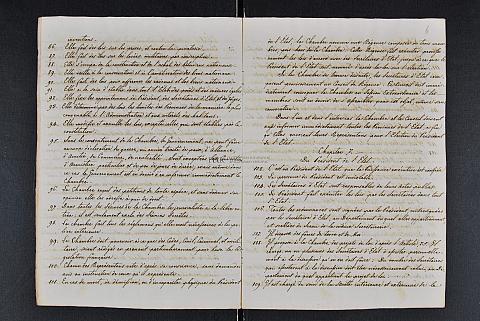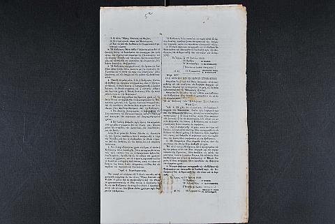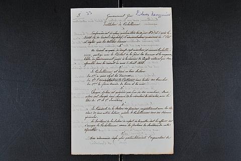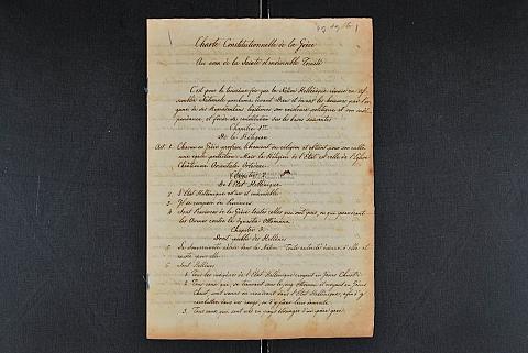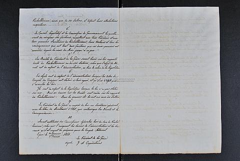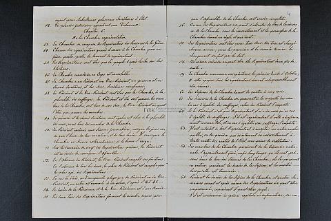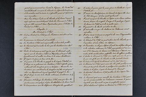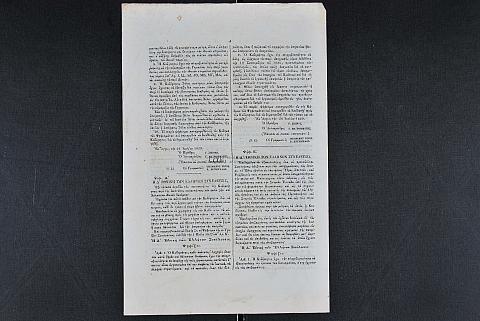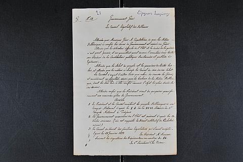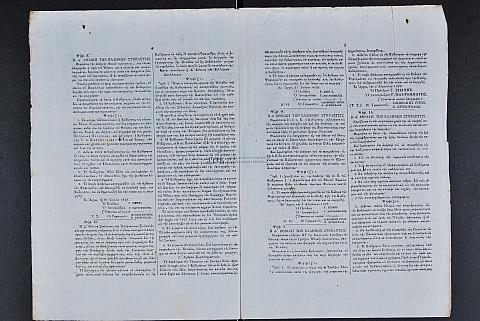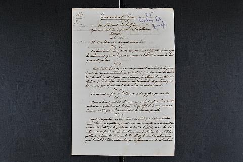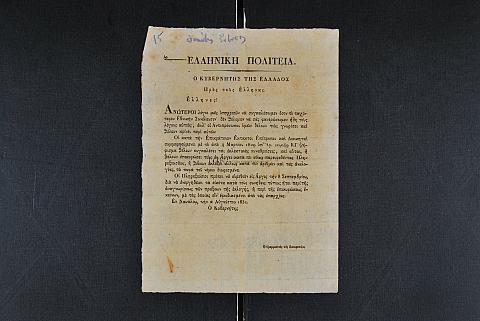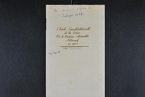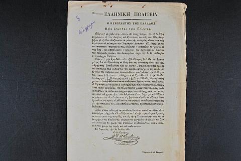 Σύνταγμα του 1827 (1, 2, 16), μετάφραση επιστολής προς την Κοινοβουλευτική Επιτροπή (3), Δικαιώμενα που εγγυάται το Σύνταγμα προς τους Έλληνες (4), έντυπο Ψήφισμα Δ' Εθνοσυνέλευσης (5), έντυπος Λόγος του Κυβερνήτη Ιωάννη Καποδίστρια (6), έντυπη Εγκύκλιος περί σύστασης Εθνικής Τράπεζας (7), έντυπο Διάγγελμα του Κυβερνήτη (8), Εγκύκλιοι Κυβερνήτη (9-15, 26), Ψήφισμα Εθνοσυνέλευσης Τροιζήνας-διορισμός Κυβερνήτη (17), Διάγγελμα προς τον λαό (18), έγγραφο Κυβερνήτη προς τη Βουλή με Διάγγελμα 17/1/1828 (19), έγγραφο Κυβερνήτη προς την Προσωρινή Κυβέρνηση (20), Εγκύκλιος Εθνοσυνέλευσης 18/7/1828 (21), Περί όρκου-Ψήφισμα (22), Περί εσόδων (23), Σύσταση Εθνικής Τράπεζας (24), Λογοδοσία Κυβερνήτη (25), Πρόσκληση προς το Πανελλήνιο για συνεισφορά (27), Διάγγελμα Κυβερνήτη 20/7/1828 (28), πρόσκληση περί Εθνικής Συνέλευσης (29), Διοικητική Διαίρεση της Ελλάδας (30), Οργανισμός του Πανελληνίου (31), περί Διορισμού Επιτρόπων Διοικητών (32), Σύσταση Πανελληνίου (33), έντυπος Κώδικας Ψηφισμάτων (34), επιστολή προς τον Πρέσβη της Μεγάλης Βρετανίας στην Κωνσταντινούπολη Στράτφορντ Κάνινγκ 10/9/1828 (35), Οργανισμός Γερουσίας 8/9/1829 (36), Ορκωμοσία Υπουργών 23/10/1829 (37), Διακριτικά σημεία δημοσίων λειτουργών (38, 39), περί της θέσης των Γερουσιαστών 16/10/1829 (40), Εξέλεγξις εθνικών γαιών (41), Ψήφισμα Γερουσίας περί αταξιών και επαναστατικών κινήσεων Πόρου (42)