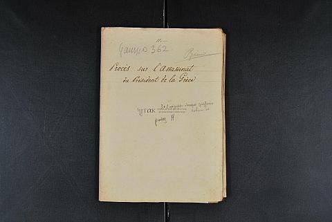 Περιέχει έγγραφα από τη διαδικασία της δίκης για τη δολοφονία του Κυβερνήτη Ιωάννη Καποδίστρια: Έκθεση (αντίγραφο) του Ν.Γ. Παγκαλάκη προς τον Γλαράκη σχετικά με το περιεχόμενο εγγράφων δικογραφίας και σχετική διαβιβαστική επιστολή (1, 2), επίσημα πρακτικά καταθέσεων με τίτλο "Εξακολούθησις της Δικογραφίας αφορώσης την Δολοφονίαν της Α.Ε. του Αειμνήστου Κυβερνήτου της Ελλάδος Κώμητος Ιωάννου Α. Καποδίστρια", σσ. 15 (3), Πρακτικά ανακρίσεων του Στρατοδικείου, 7 τετράδια, σσ. 133 (4)