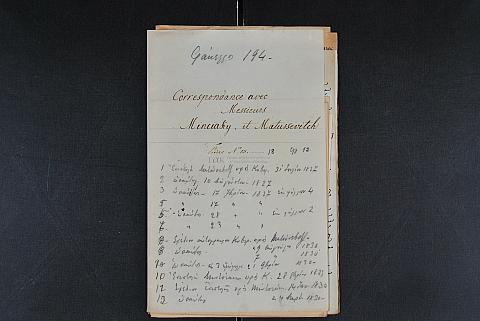 Περιέχει επιστολές του Matussevitch προς τον Κυβερνήτη Ιωάννη Καποδίστρια από την Αγία Πετρούπολη (1-6), σχέδια επιστολών του Κυβερνήτη προς αυτόν (7-9), επιστολή του Minciaky προς τον Ιωάννη Καποδίστρια από το Βουκουρέστι (10) και σχέδια επιστολών του Κυβερνήτη προς αυτόν (11-12)