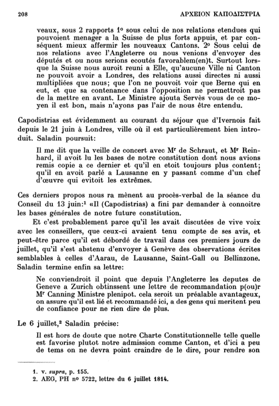 Capodistrias est évidemment au courant du séjour que d’Ivernois fait depuis le 21 juin à Londres, ville où il est particulièrement bien introduit. Saladin poursuit: