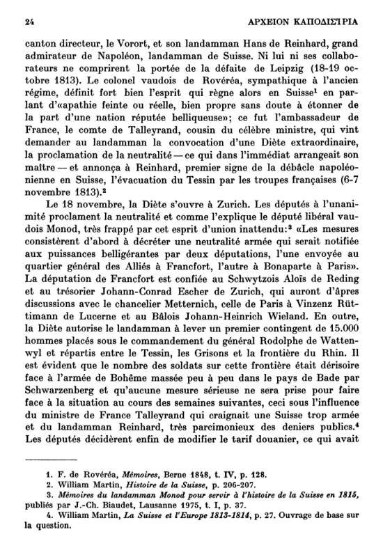 5. AEG, ms hist. 45, f. 6v, no 1035 no 2: lettre de Capodistrias à Nesselrode (Berne, 6/18 novembre 1813), publiée en partie dans W. Martin, op. cit., p. 42.