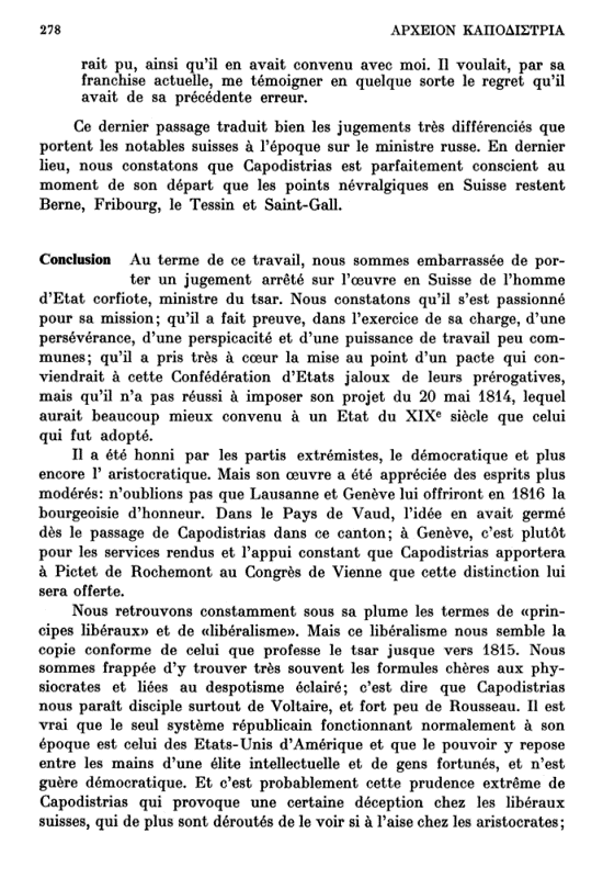 Au terme de ce travail, nous sommes embarrassée de porter un jugement arrêté sur l’œuvre en Suisse de l’homme d’Etat corfiote, ministre du tsar. Nous constatons qu’il s’est passionné pour sa mission; qu’il a fait preuve, dans l’exercice de sa charge, d’une persévérance, d’une perspicacité et d’une puissance de travail peu communes; qu’il a pris très à cœur la mise au point d’un pacte qui conviendrait à cette Confédération d’Etats jaloux de leurs prérogatives, mais qu’il n’a pas réussi à imposer son projet du 20 mai 1814, lequel aurait beaucoup mieux convenu à un Etat du XIXe siècle que celui qui fut adopté.