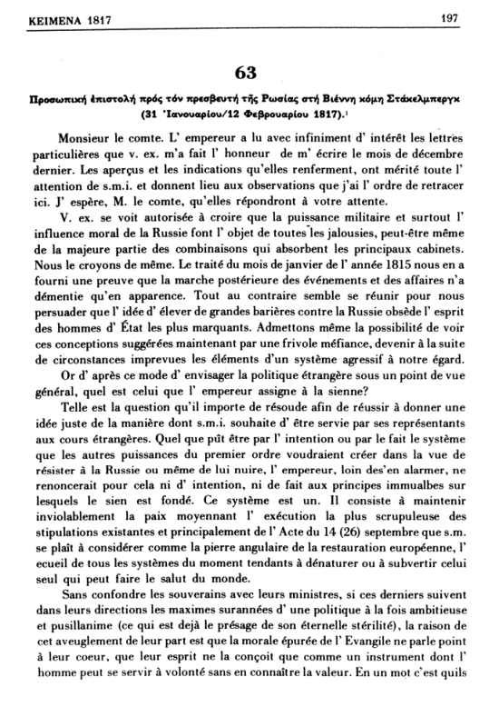 Προσωπική επιστολή προς τον πρεσβευτή της Ρωσίας στη Βιέννη κόμη Στάκελμπεργκ (31 Ιανουαρίου/12 Φεβρουάριου 1817).1