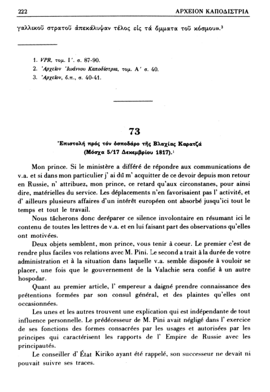 2. Βλ. τις οδηγίες του Καποδίστρια προς τον Στρόγγανωφ (24 Δεκ. / 5 Ιαν. 1817), VPR, τομ. Θ σ. 387-388.