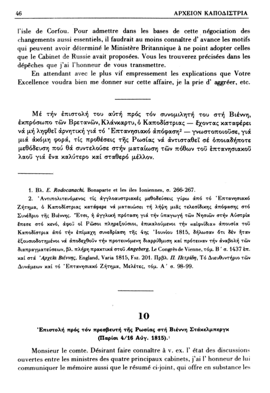 2. Χάρη στις διπλωματικές πρωτοβουλίες του Καποδίστρια βελτιώθηκε το κλίμα των σχετικών διαπραγματεύσεων και οι Βρετανοί έδειξαν σχετική προθυμία να υιοθετήσουν τις ρωσικές προτάσεις για τη συγκρότηση ενός ενιαίου και ανεξάρτητου κράτους «των * Ηνωμένων Ιονίων Νήσων». Ο Καποδίστριας δεν είχε παραλείψει να ενημερώσει τον Κάστελρυ για την «αμετάκλητη» απόφαση του τσάρου να προστατεύσει αδιάπτωτα την ύπαρξη της Επτανήσου, βλ. 77. Πετρίδη, Το Διευθυντήριο των Δυνάμεων και το Επτανησιακό Ζήτημα, Μελέτες τομ. Α σ. 101 επ.
