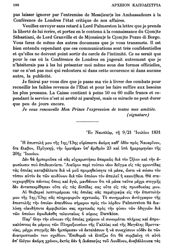 Σας παρακαλώ να αποστείλητε άνευ αργοπορίας προς τον λόρδον Palmerston την επιστολήν, την οποίαν λαμβάνω το θάρρος να του απευθύνω, και ανακοινώσατε το περιεχόμενόν της προς τον κόμητα Sébastiani, τον λόρδον Granville και τον κόμητα κύριον Pozzo di Borgo. Θα κάμητε το αυτό και διά τα άλλα έγγραφα τα οποία σας αποστέλλω. Εννοείται βεβαίως ότι αι ανακοινώσεις αυταί είναι λίαν εμπιστευτικαί και ότι δεν πρέπει να εξέλθουν του κύκλου της οικειότητος. Μόνον εις την περίπτωσιν, κατά την οποίαν η Διάσκεψις του Λονδίνου θα έκρινε κατά διαφορετικόν τρόπον, δεν θα εδίσταζα να τας παρουσιάσω εις εκείνην εγώ ο ίδιος, υπό επίσημον μορφήν, διότι δεν είμαι εγώ εκείνος ο οποίος θα φοβηθή εις ταύτην την περίπτωσιν ή εις οιανδήποτε ετέραν, την δημοσιότητα.