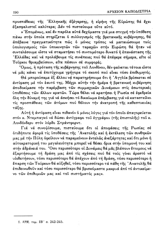 »Επομένως, και αν παρόλα αυτά δεχόμαστε για μια στιγμή την υπόθεση πάνω στην οποία στηρίζεται ο συλλογισμός της βρετανικής κυβέρνησης, θα απέβαινε πραγματικότητα πως ο μόνος τρόπος να ματαιώσουμε τους υπολογισμούς των υποκινητών των ταραχών στην Ευρώπη θα ήταν να συντελέσουμε ώστε να σταματήσει το συντομότερο δυνατό η επανάσταση της Ελλάδας και να προλάβουμε τις συνέπειες που θα επέφερε σήμερα, είτε οι Τούρκοι θριαμβεύσουν, είτε πέσουν σε συμφορές.